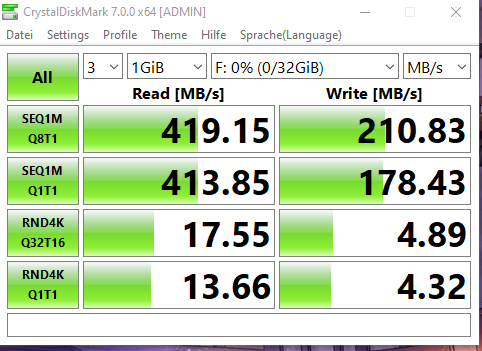 - Sequentielles Lesen (Q8T1): ~419 MB/s